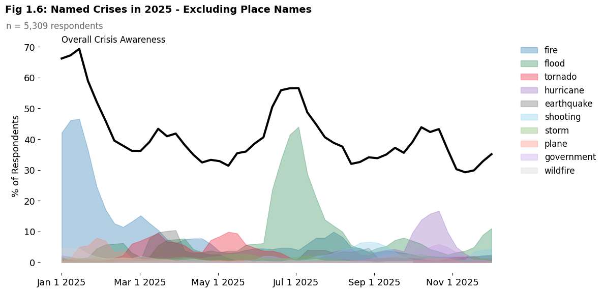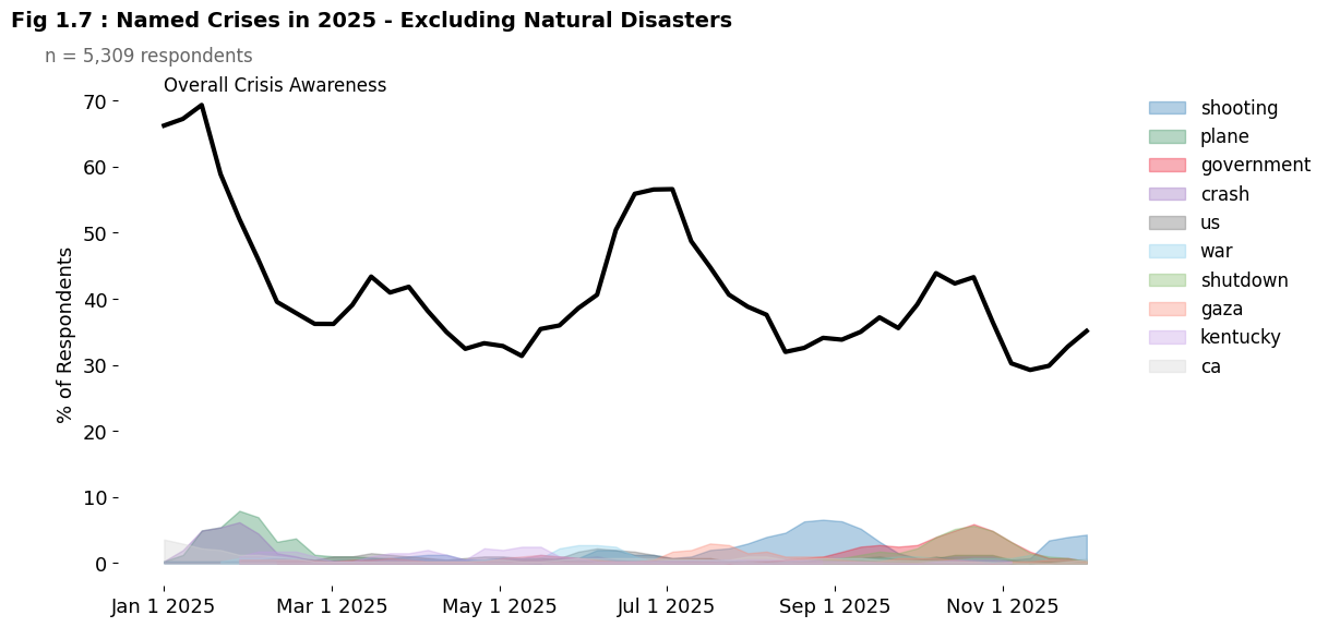 We asked people to describe any current event that would require support. Among these, natural disasters were the most frequently named events, with the Los Angeles wildfire (January) and the Texas floods (July) leading the way. If we examine non-natural disaster events, we see “shootings” appear for the first time. The US federal government shutdown in October was also named as one of the most noted events of 2025.