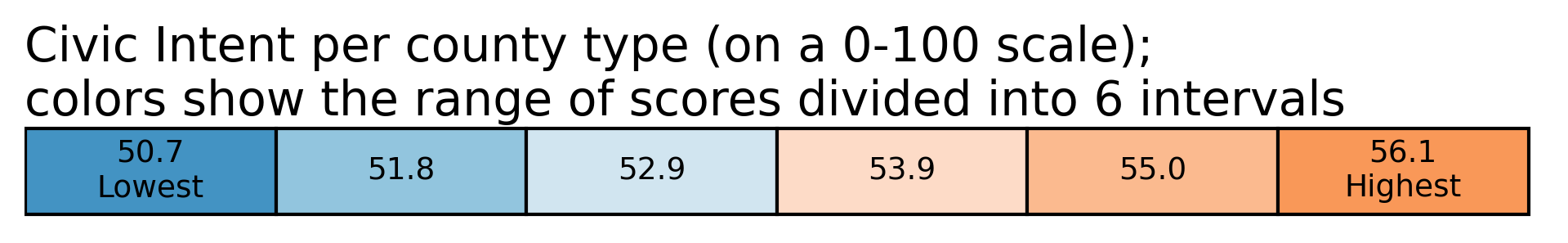 People have remarkably similar levels of Civic Intent in every part of the US, based on American Community Project's (ACP) county-types profiles. On a 0-100 scale, the range is 55-59.