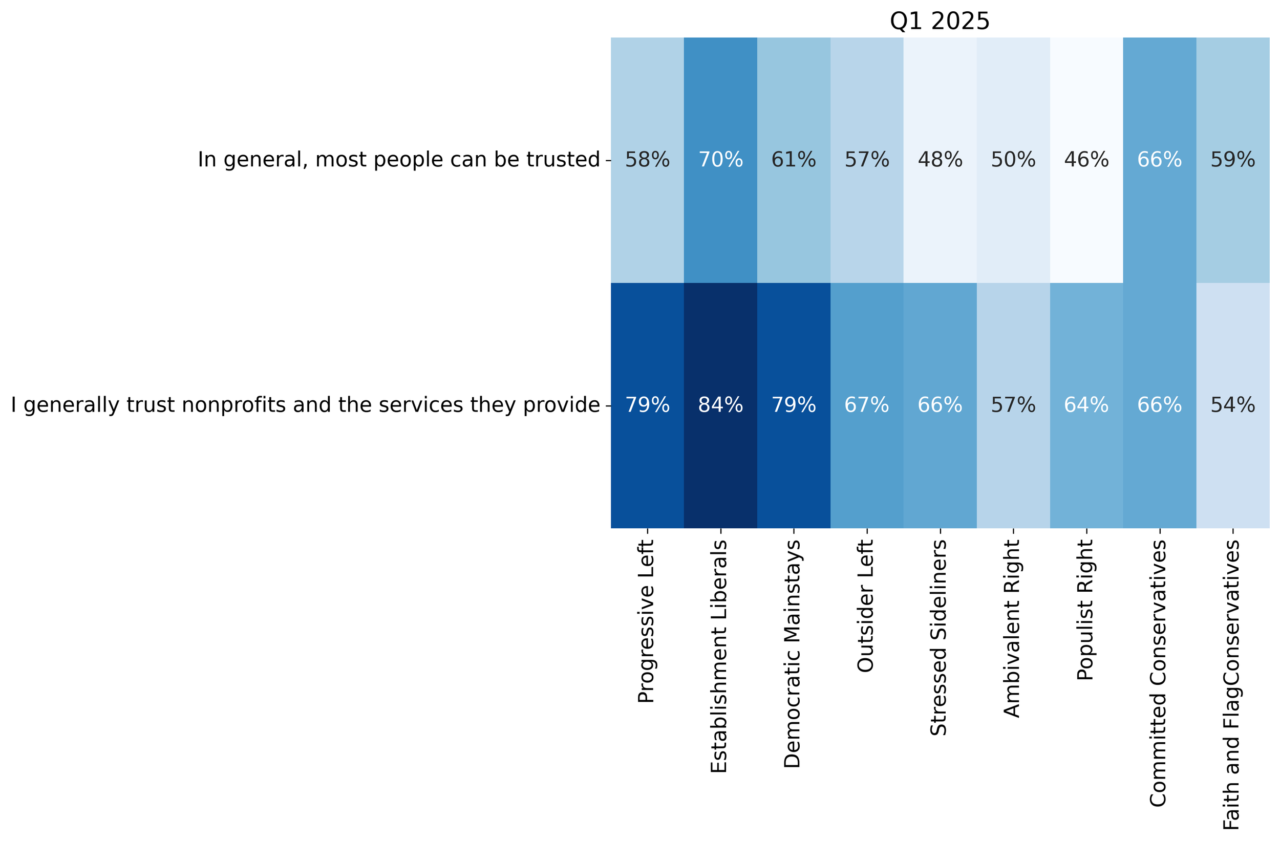 A consistent majority of Americans report generally trusting other people. Over the past year, this trust has remained largely stable, with no major quarter-over-quarter or year-over-year shifts. Politically, trust in others and in nonprofits remain higher on the left, though trust in others among left-leaning individuals has declined over previous quarters and is down 10% since Q3 2024. It is also lower among centrists generally speaking (unchanged compared with 2024), while trust in nonprofits has declined since Q4 2024.